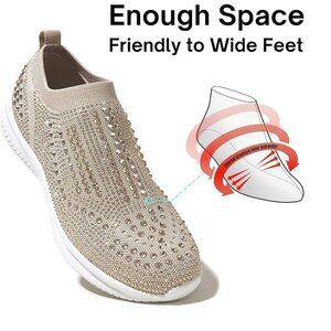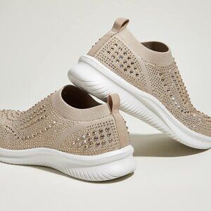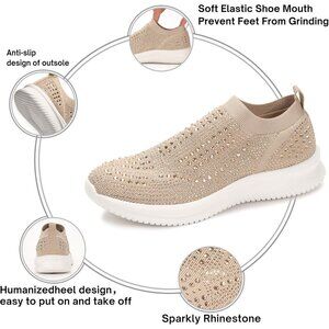 🆕 Women's Rhinestone Mesh Slip-On Walking Shoes Fashion Sneaker Beige Fabric