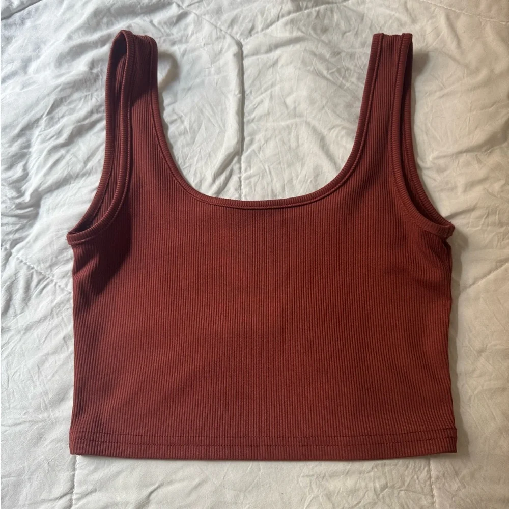 Elevate your wardrobe with this stylish ribbed tank top. Perfect for layering or wearing on its own, this rust-colored top adds a touch of warmth to any outfit.