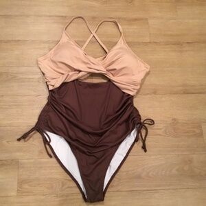 Brand new without tags women’s size 2XL (size chart in photos) brown ribbed one piece bathing suit. Features V neck, cutout tummy, ruched design, adjustable criss cross back with self tie, drawstring sides, removable padded cups, ribbed fabric and fully double lined.