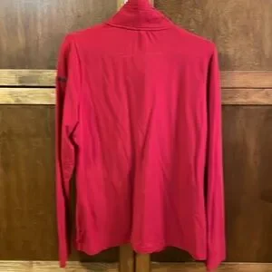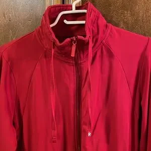 Stylish and comfortable red zip up jacket with drawstring neck, open front pockets, deeper red color, good condition.
