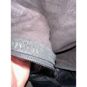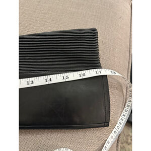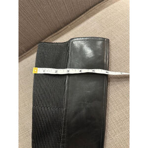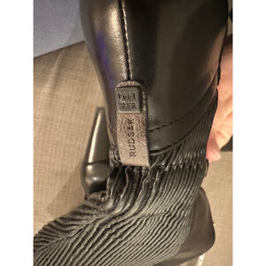 These are pre-owned Rudsak black leather knee-high wedge boots. They feature a leather foot and a ribbed elastic shaft with a side zipper for closure. The wedge heel is approximately 3 inches high. The boots show minor creasing on the leather and slight wear on the soles. The interior lining is intact. The boots are marked with the Rudsak logo on the back and inside.