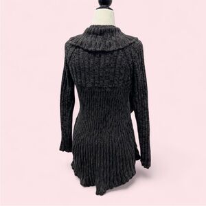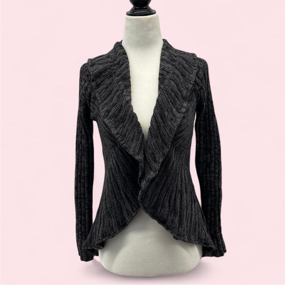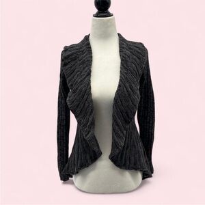Y2K whimsical charcoal grey ruffle front open knit cardigan