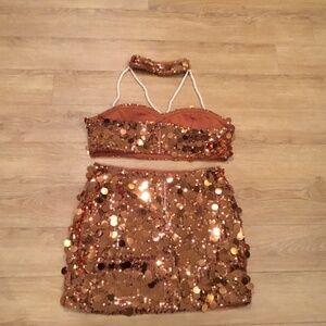 Brand new without tags NIKBK women’s size L gold sequin dot crop top and matching mini skirt. Muiltiways to wear as halter with attachable beaded chain and off the shoulder. Crop top has a zipper back closure. Concealed rear centre zipper and the shiny sequins adds a chic look when going out. Skirt is a slim fit with high waist and mini length. 95% Polyester and 5% Elastane