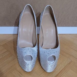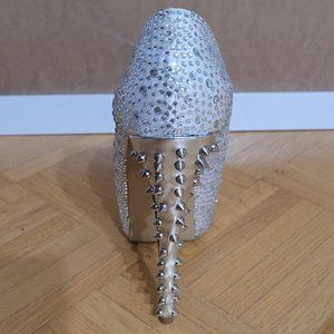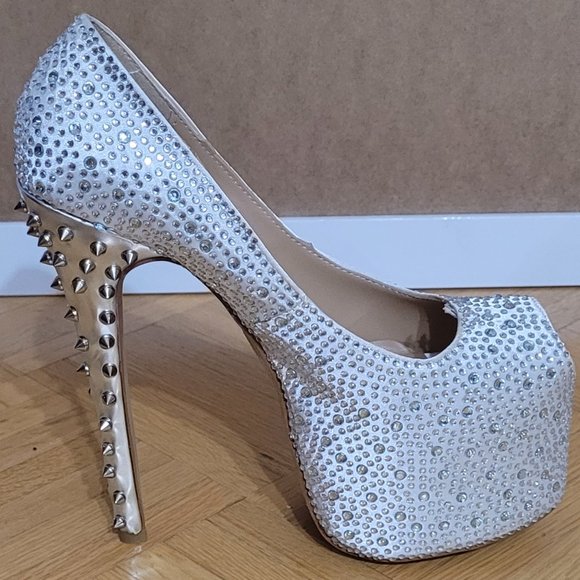Perfect wedding, club, party shoes with sparkly rhinestones, thin high heels with rivets open toe platform.