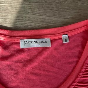 This is a women’s shirt. Its brand is Patrizia Luca. It is size small but I believe it’s fits a bit larger. Maybe could be good for a maternity shirt. Its colour is coral and is in good used condition. It is 100% polyester.