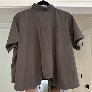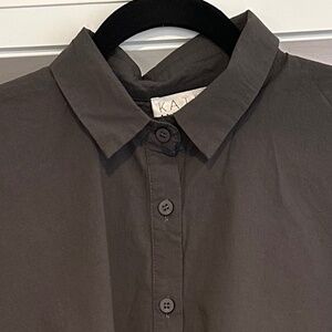 Elevate your wardrobe with this elegant dark gray blouse. Perfect for any occasion, this top offers a classic look with its short sleeves and button-down design.