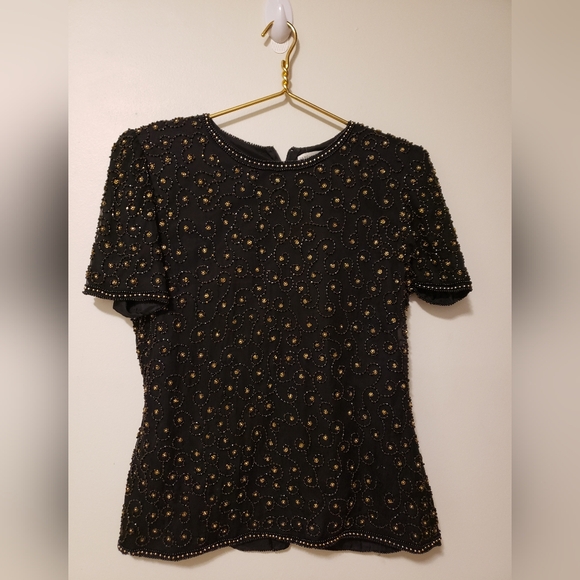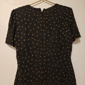 used condition top. silk outer shell and poly lining. Has a zipper down the back. Wife says approximately modern medium fit.