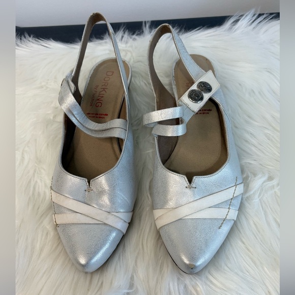 Step out in style with 's elegant slingback flats. Featuring a chic silver and cream design, these shoes are perfect for any occasion.