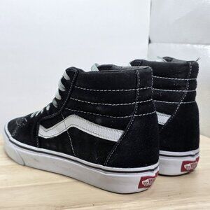 The product is a pair of Vans Sk8-Hi W7 Black White Canvas High Top Skate Shoes in women's size 8. These stylish and comfortable sneakers feature a lace-up closure, high-top shoe shaft style, and a rubber outsole for durability. Perfect for activewear or casual occasions, these shoes are accentuated with the Vans logo and are ideal for skateboarding or everyday wear during the summer, fall, and spring seasons. Made with canvas fabric and suede upper material, these sneakers are a must-have for any woman looking for a fashionable and practical shoe option.