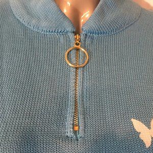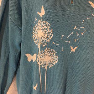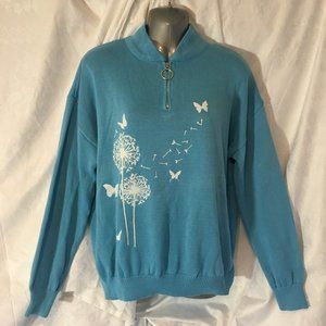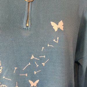 Womens Size Large Light Blue Knit Zip Sweater Dandelion Puff Butterfly Vintage