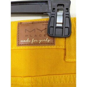 This women's skirt from My Place is a must-have for any fashion-forward individual. The yellow denim material is accented with distressed details and racing stripes, giving it a unique and edgy look. The skirt has a mid-rise and is a short mini length, making it perfect for both casual and travel occasions. It features a button closure and pockets for added convenience. The skirt is machine washable and made in Brazil, ensuring both quality and authenticity. This skirt is ideal for summer, fall, or spring seasons and is available in size 16. Add this hippie-inspired piece to your wardrobe for a touch of personality to your outfits.