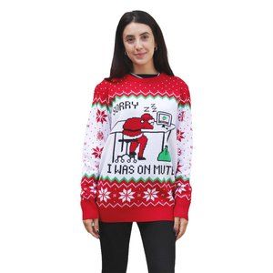 Christmas Sweaters Canada pride themselves on creating clothes that are novel and unique. Our sweater is designed in festive shades of red and white with hints of green making it perfect for your holiday wardrobe. The design depicts a Santa sitting in front of a screen and echoing the sentiment that most of us have gone through during online meetings, of being on mute while we nap or eat or basically do anything other than pay attention to what is happening on screen. Clearly, Santa needs a break and is also indulging in a much-needed nap.