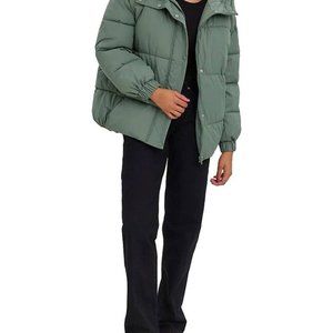 Multi-utility jacket with front zip closure and attached hood in a puffed design.
