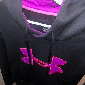 Womens black and pink Under Armour hoodie features coldgear fabric, fitted cuffs and a fitted waistband.