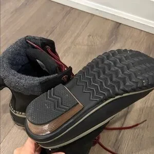 Warm and rugged winter boots. Black leather with gray lining. Red lace details. Ideal for cold weather.