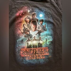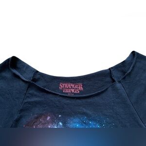 Great condition! Long-sleeved black knit top with graphic from the first season of Stranger Things. Neckline has raw edge. The fabric is thicker than that of a t-shirt, but thinner than a sweatshirt.