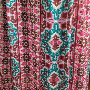 This boho-style strapless dress features a flowing, airy silhouette that captures the essence of effortless elegance. The fabric drapes beautifully, allowing for a gentle movement with every step. The design blends soft, earthy tones with vibrant hints of fuchsia and teal, creating a striking contrast. The dress's relaxed fit is perfect for warm-weather outings, while the playful splashes of color add a touch of whimsy. Its bohemian vibe is enhanced by bold patterns, offering a perfect balance of free-spirited style and chic sophistication. Ideal for a summer day or a laid-back evening event.