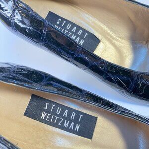 Classic Stuart Weitzman pumps crafted in glossy black croc-embossed patent leather. These elegant heels feature a sleek pointed toe and timeless silhouette, perfect for both office and evening wear. Size 8 with standard B width. Light wear consistent with age and a noticeable scuff on inner exterior of both shoes (shown in photos), but still highly wearable. A chic and versatile pair from a luxury brand known for craftsmanship and style.