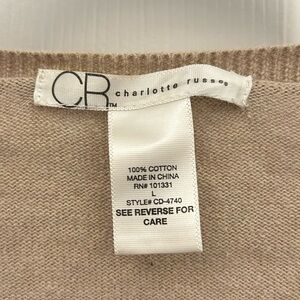 Great for layering, this tan cardigan sweater has shirt sleeves and is great for the office in the summer and putting over a tank top. Buttons in front allow it to be worn open or closed. 100% cotton, so nice breathable fabric with no synthetics. Machine wash cold. 19” pit to pit across back.