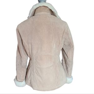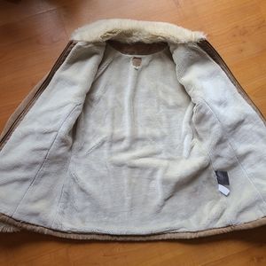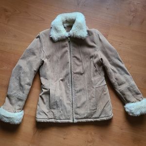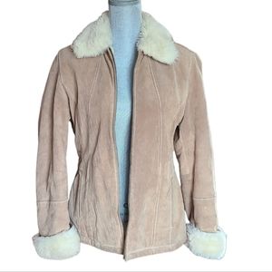 Stay stylish and warm with this elegant tan suede jacket featuring luxurious cream fur trim. Perfect for any occasion.
