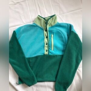 Stay cozy with this stylish teal and green fleece jacket. Perfect for layering in cooler weather. Top half is button up. Elastic adjustments at the bottom. Three pockets.