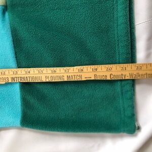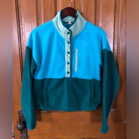 Stay cozy with this stylish teal and green fleece jacket. Perfect for layering in cooler weather. Top half is button up. Elastic adjustments at the bottom. Three pockets.