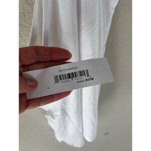 This is a new with tags "The Drop" brand, "Payton-White-M" model, one-shoulder top in size medium. The garment is white and appears to be made of a soft, slightly stretchy material, as indicated by the tag which states 94% modal and 6% elastane. The top is currently hanging on a black hanger and has its original tag attached. It is in new condition, free from any visible defects or signs of wear.