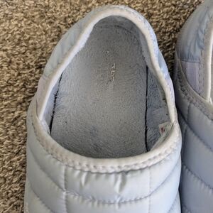 Really nice pair of light blue, lightweight slippers from North Face. They have a puffy quilted outside, soft interior and white treaded soles.