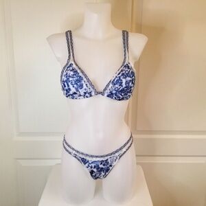 Brand new Kujurnms women’s size M white and blue triangle bikini set. Triangle top has adjustable double straps with metal sliver ring and removable padded cups. Matching double strap sides cheeky bottoms. Both pieces are double lined and have lace detailing.