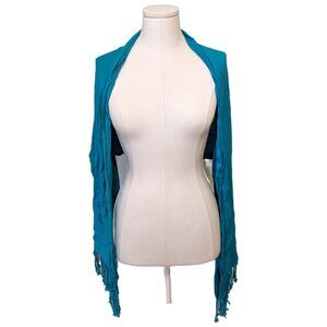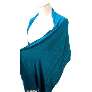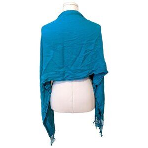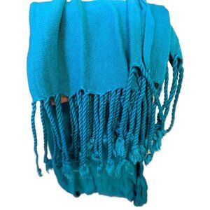 Lovely blue scarf with fringes! Soft fabric and in perfect condition! It is wide so it can be worn as a wrap or be worn as a scarf.