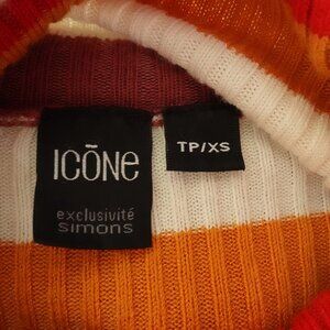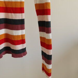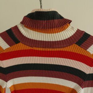 Turtleneck sweater from Simons. Featuring a vibrant mix of stripes in rich fall colors, this sweater is a perfect blend of comfort and fashion. The ribbed texture adds a flattering fit while the high neckline offers a chic look.