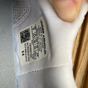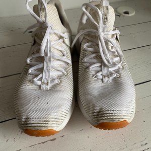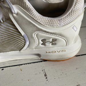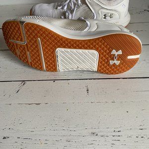 Worn about 10 times, this is a pair of all white Under Armour HOVR Rise training shoe. They sit above the ankle so have amazing support. They fit true to size and are very stable and comfortable. They would be great for pickleball, training, boot camp, working out or any other court sports.
