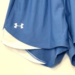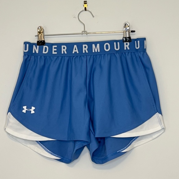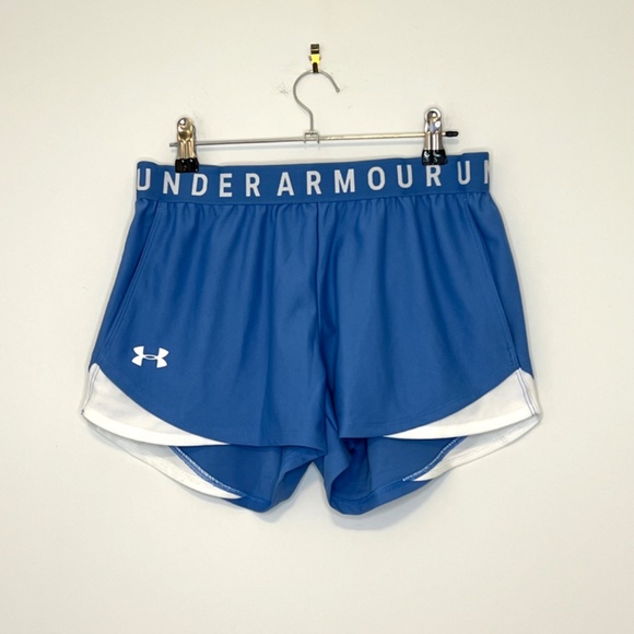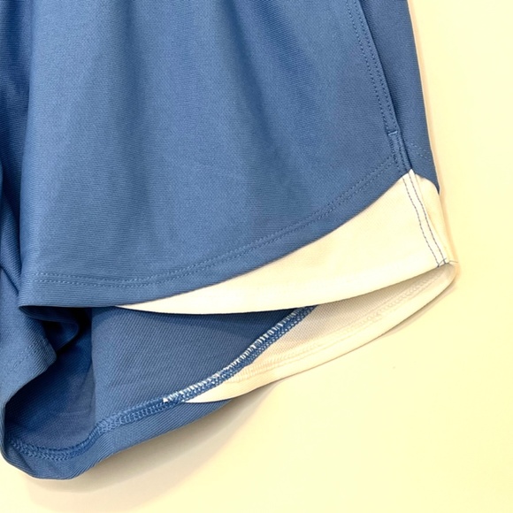 These new with tag Under Armour Shorts are a lovely Periwinkle blue colour with white accents. The shorts are size small, loose fit. Slightly longer in the back than the front. The length is 11 inches in the front and 13 inches in the back.