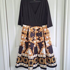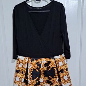 Shein Women's V Neck Gold, Black + White Print Dress, lightly used, excellent condition, Size XL, size runs smaller