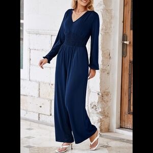Brand new without tags women’s size L navy blue V neck long sleeve wide leg jumpsuit romper with pockets. Features long sleeve with elastic cuffs, V-Neck, high smocked waist, two side pockets and a loose fit. Made of lightweight and soft material that is very flexible and breathable. 65%Polyester+30%Viscose+5%Elastane
