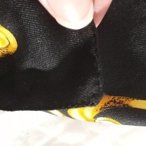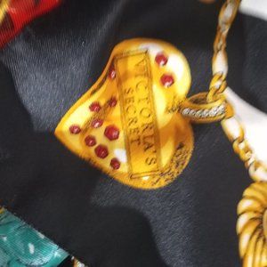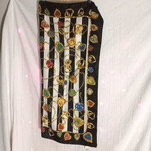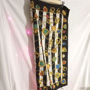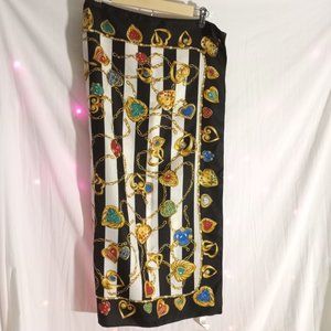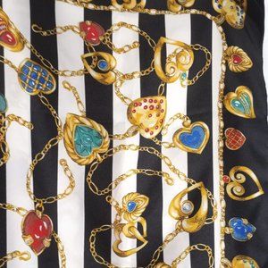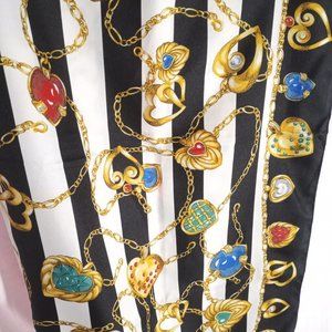 Women's Victoria's Secret Vintage black and white striped silky scarf. Gold chains and heart charms with gemstones printed all over the scarf.