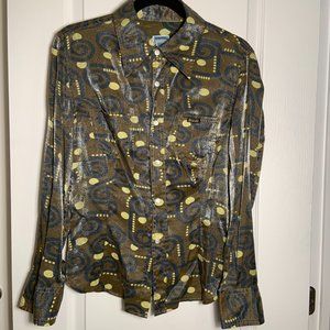 Gorgeous button up Diesel shirt in funky print. Material has a definite sheen and sparkle to it. Lots of beautiful detail like 2 breast pockets, snap buttons and triple snap button closure at end of sleeves.