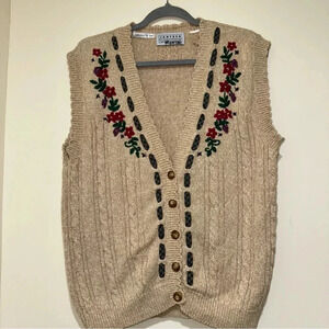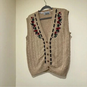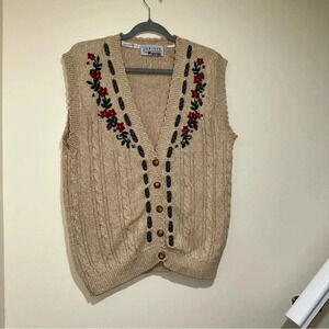 Women’s Vintage Floral Plaid Hand Embroidered Tan Knitted Buttons Sweater Vest