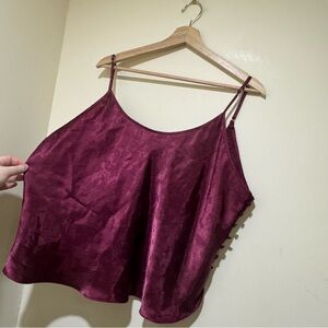 Luxurious satin camisole with a rich hue. Perfect for layering or wearing alone. Great for sleep or wearing for a night out look. Has button details on the side and a lower back. Adjustable straps. In Great condition no issues or flaws. 100% polyester. Has a slight paisley pattern. Not a ton of stretch. Measurements included in photos