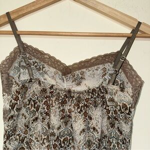 Y2K brown cami top with intricate patterns and lace trim. Perfect for a stylish and comfortable look. Slight sparkle all through the tank top. In great condition no issues or flaws. Brand tag is hard to see and read. Adjustable straps. Material tag is in another language.