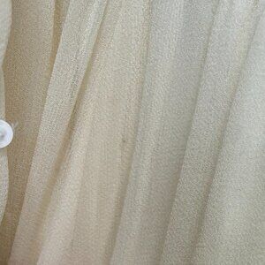 This elegant, vintage-inspired maxi dress features a sheer off-white neckline and long sleeves, both finished with hook and eye closures for a secure fit. Structured shoulder pads add definition, while the silver and white embellishments on the upper half add a shimmering touch. The sheer silk overlay gives a delicate, airy effect while the beading adds the glam and sparkle. The lower half flows into a cream skirt with subtle vertical pleating and a lettuce hem that creates bounce and movement. The back has a 'open' feel because the fabric is mostly sheer. Fully lined with a soft polyester inner layer. This dress is a perfect blend of glamour, comfort and style. - Made in China