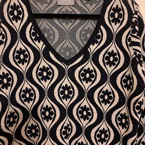 Cyrus V-neck beige and black patterned sweater. Never worn, Size X-large, blend of Viscose 65% and 35% Nylon. Hand wash, lay flat to dry.