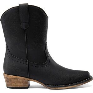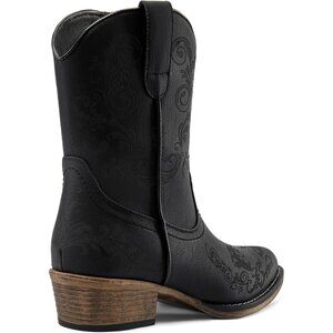 Vintage Patterns: The vegan leather upper is adorned with an engraved pattern that adds a touch of retro charm to these cowgirl boots, crafted for the modern cowgirl with an eye for fashion and a heart of adventure.