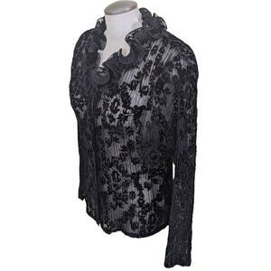 This Women's Whimsigoth Top in black sheer velvet with a ruffle collar is a mysterious and enchanting piece perfect for a variety of occasions. The long sleeves, button closure, and lightweight fabric make it ideal for all seasons, from winter to summer. The floral pattern, vintage-inspired accents, and alt baddie theme add a touch of dark romance to this basic blouse, making it a standout addition to any wardrobe. Made from a blend of polyester and rayon, this top by Tabi is designed for regular fit and is machine washable for easy care. Measurements (approximate, laid flat, one side, double to go all way around where applicable)