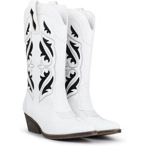 Women's White Embroidered Pointed Toe Chunky Block Heel Cowgirl Western Booties