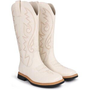 Women's White Embroidered Square Toe Side Zipper Western Mid Calf Dress Boots