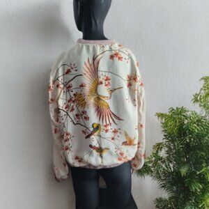 This jacket is a bold fusion of street style and intricate artistry, featuring an eye-catching design of soaring cranes. The sleek, urban silhouette is complemented by subtle yet striking details—smooth, high-quality fabric, sleek zipper, and minimalist cuff designs that give it a modern edge. Whether paired with jeans or layered over a tshirt this jacket speaks to those who want to stand out with a touch of culture and a lot of cool. Perfect for anyone looking to add a unique flair to their wardrobe.
