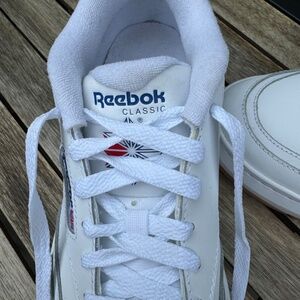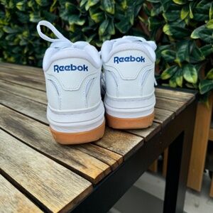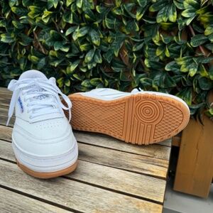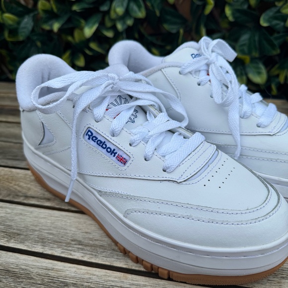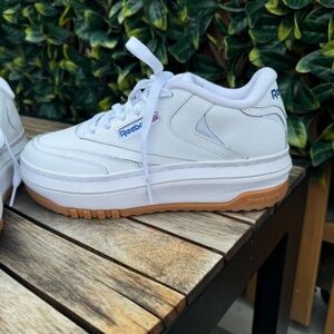 These chunky women's Reebok Classics, with blue detailing and a thick platform sole, are great casual sneakers. They are a size 8 (but fit more like an 8.5 in my opinion).
