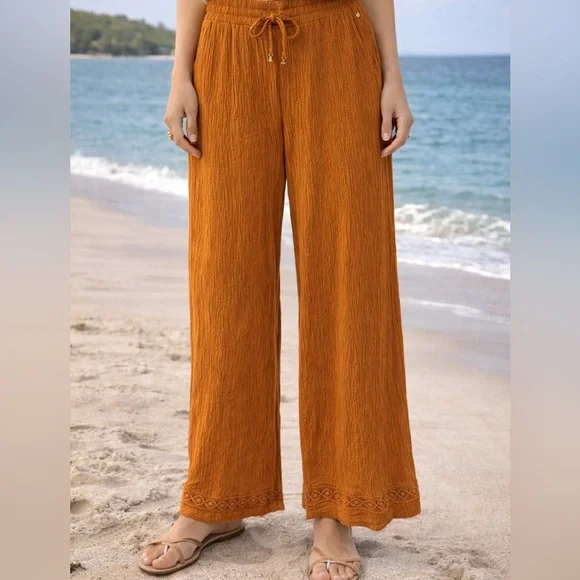 Effortless wide-leg pants in a warm rust color. Soft, textured fabric with an elastic drawstring waist for adjustable comfort. Decorative hem detailing adds a subtle feminine touch. Perfect for relaxed beach days or casual outings.
