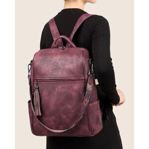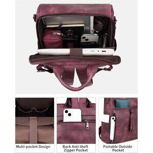 Women's Wine Red Retro Style Backpack Designer 15.6 inch PU Leather Laptop Bag